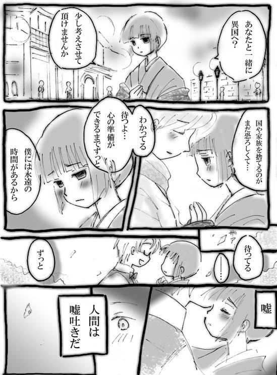 露日 パラレル注意 これの続きというか過去ネタ、100年くらい前 ・普通のロシア人のイヴァンさんと日本人の本田さん ・だけどもイヴァンさんは人外。吸血鬼だか吸性鬼(…)。 ・本田さん性悪っぽい ・ちらっとですが露日→米 気味。注意 大丈夫そうな方はどうぞ ↓ ↓